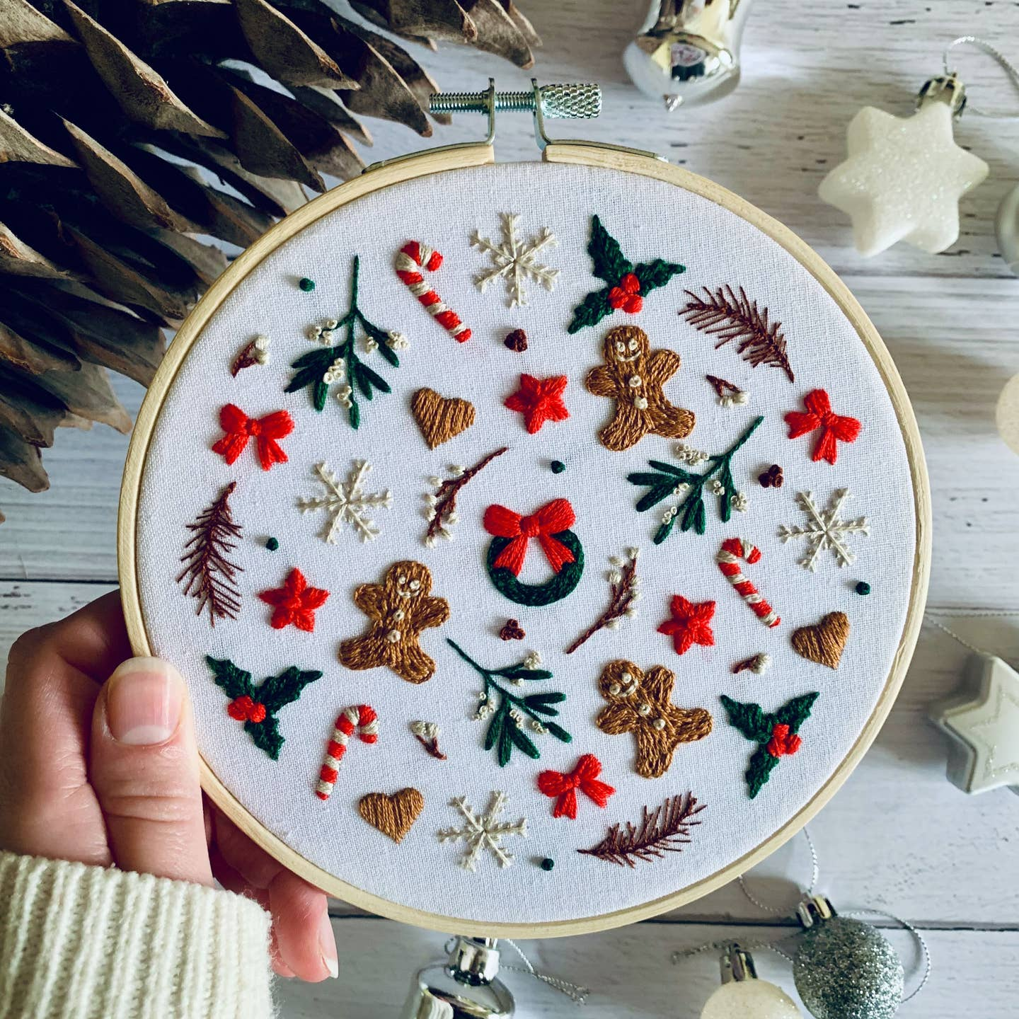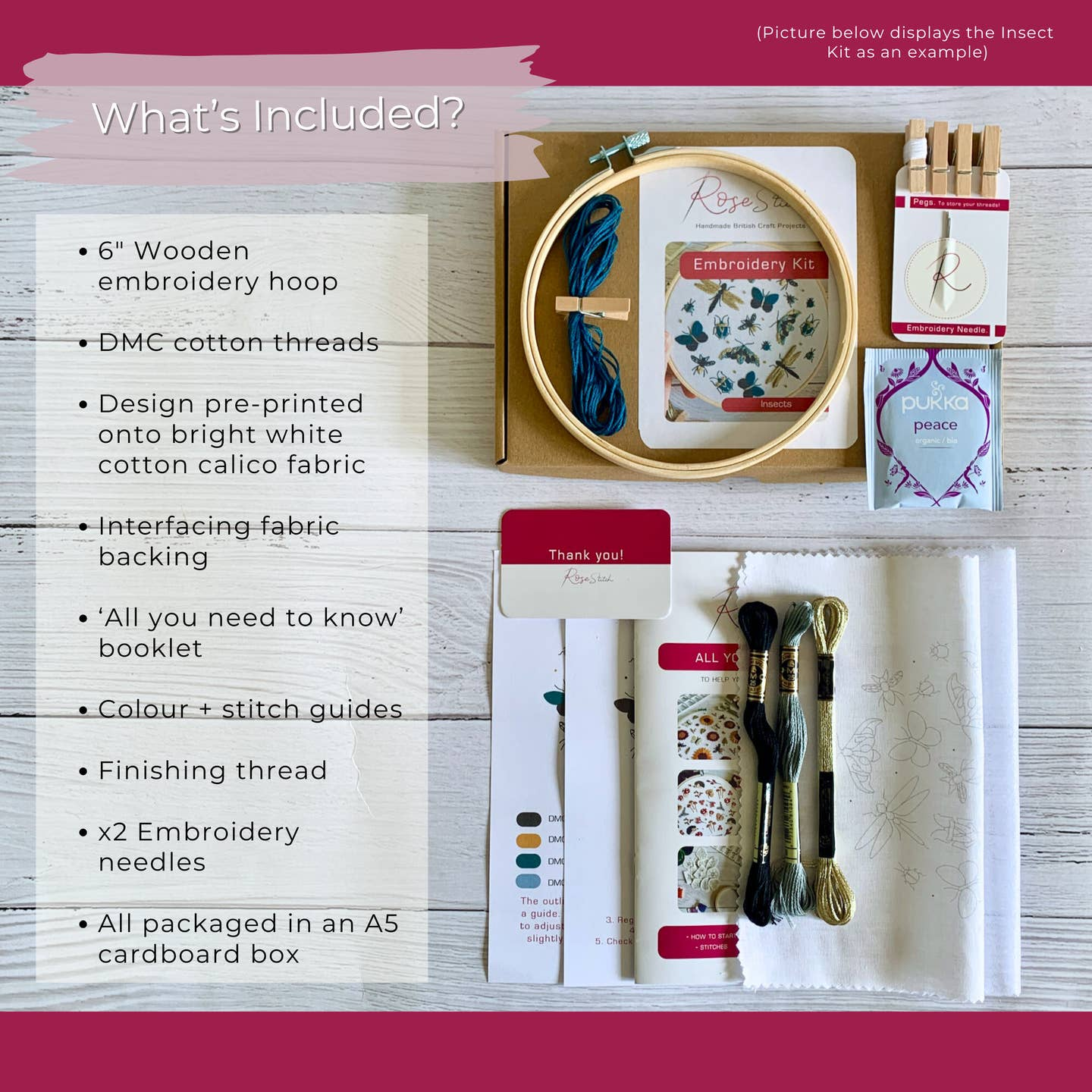 EACH KIT CONTAINS: – Your chosen design pre-printed onto bright white cotton calico fabric. – Embroidery needles – Coloured cotton threads with wooden pegs to help store – Instruction booklet featuring a colour/stitch guide, top tips and starting/finishing advice – 6″ wooden embroidery hoop – Iron on interfacing for the back of your fabric – A free rose inspired gift to help you relax!